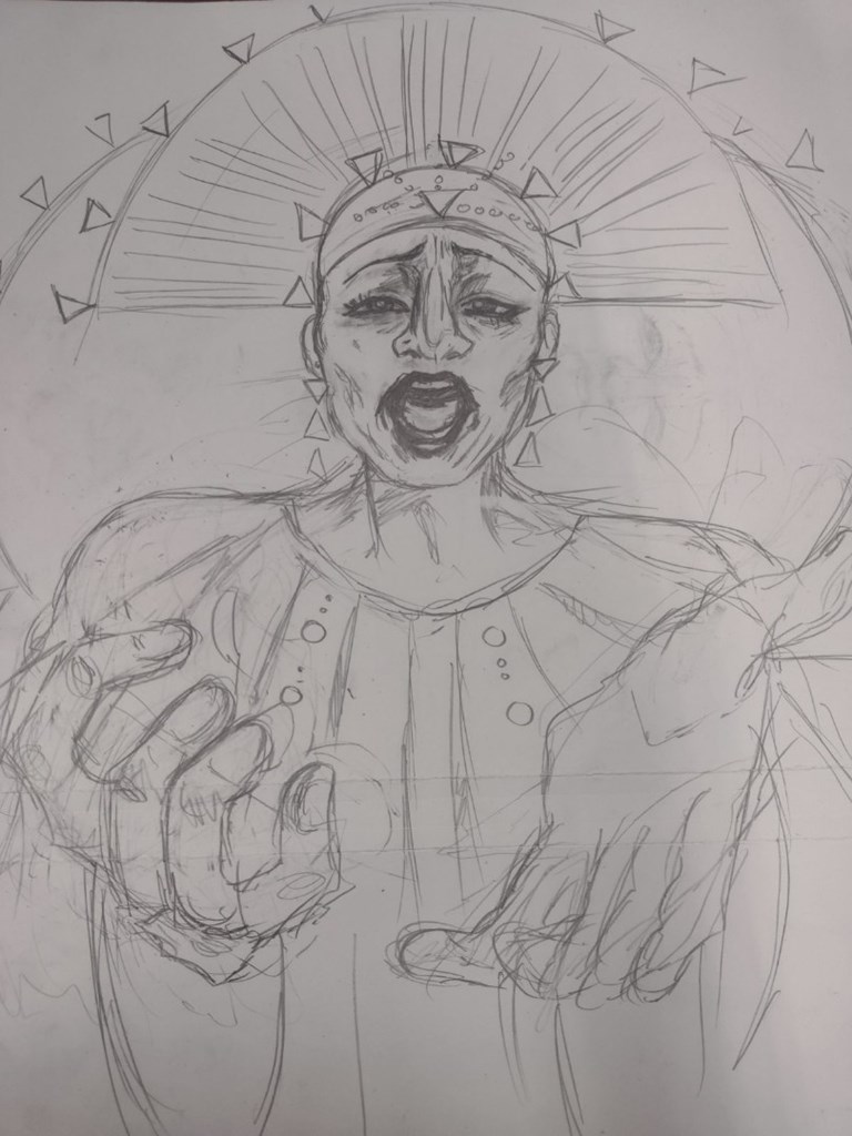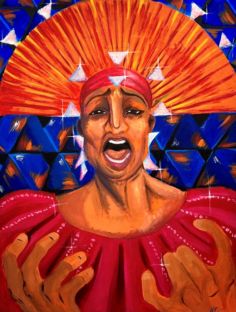 Morgan Thomas (15) Remember Me 33x44 Acrylic on Canvas This Piece was inspired by the Opera singer Jessye Norman when she sang her rendition of "When I am Laid in Earth". There was a specific part in her performance where she held her hands out to the audience and sang "Remember Me". I wanted to capture her in this moment because she was pleading to be remembered, and not just singing the song. Remember Miss Jessye Norman in ALL of her glory.