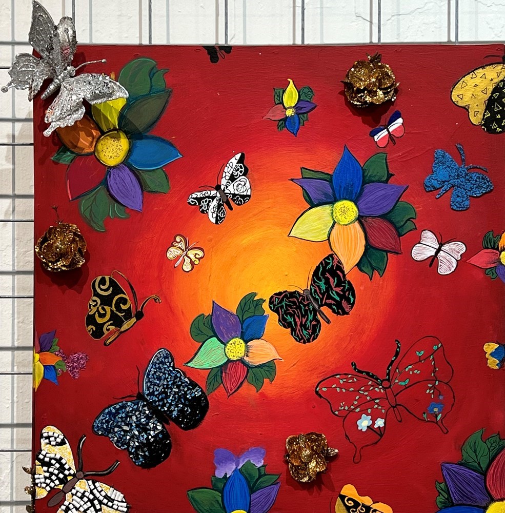 Knyliyah Williams (12) Jessye's Kaleidoscope 24x24 Mixed Media Jessye's Kaleidoscope my project is inspired by some of the dresses in Jessye Norman wore. the butterflies represent the mural in the garden. All the colors represent the school symbol and how she has a lively personality. To me all the colors and butterflies represent creativity and it makes the painting more lively. For materials i used paint, glitter, glass glitter, wire, beads, mod pog, acrylic paint markers, and epoxy.