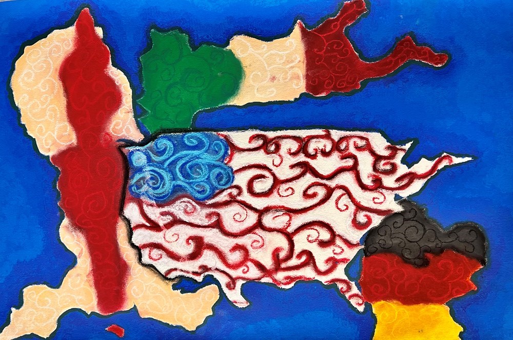 Naiyana Turner (12) Untitled 36 x 24 framed Mixed Media Reach of Legacy: My idea for my project was to sketch the countries Jessye Norman performed in. Starting by sketching out different countries and sorting there position. Out of England, Germany, Italy, and the U.S. I then decided that the U.S should be in the middle since she was born in the U.S. Then, I outlined the sketches. After that I started on the patterns in the countries based of their flag colors. Next, I started on the base layer of water which was a neutral blue. Once the base layer was finished I started stippling darker into lighter blues. Starting with a purple and blue mix and fading out into a light blue.