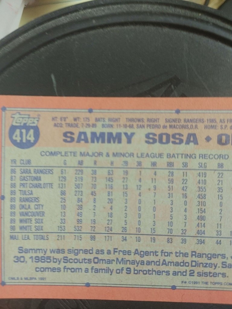 1991 SAMMY SOSA 414 ERROR CARD