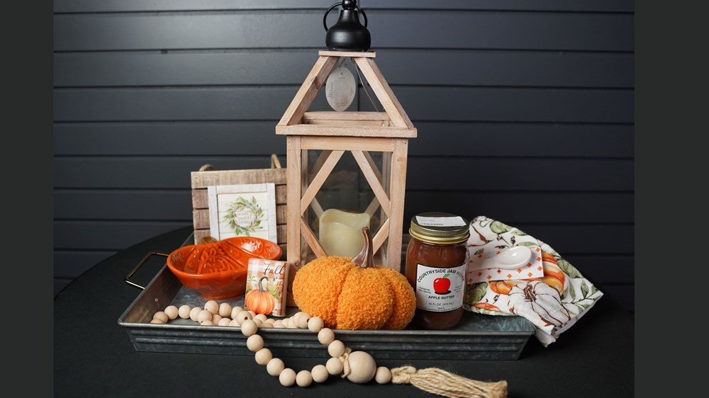 Galvanized Tray Lantern with Candle Apple Butter Pumpkin Towel Pumpkin Spoon Pumpkin Dish Fall Tissue Pack Fuzzy Pumpkin Natural Beads Home Sweet Home Decor